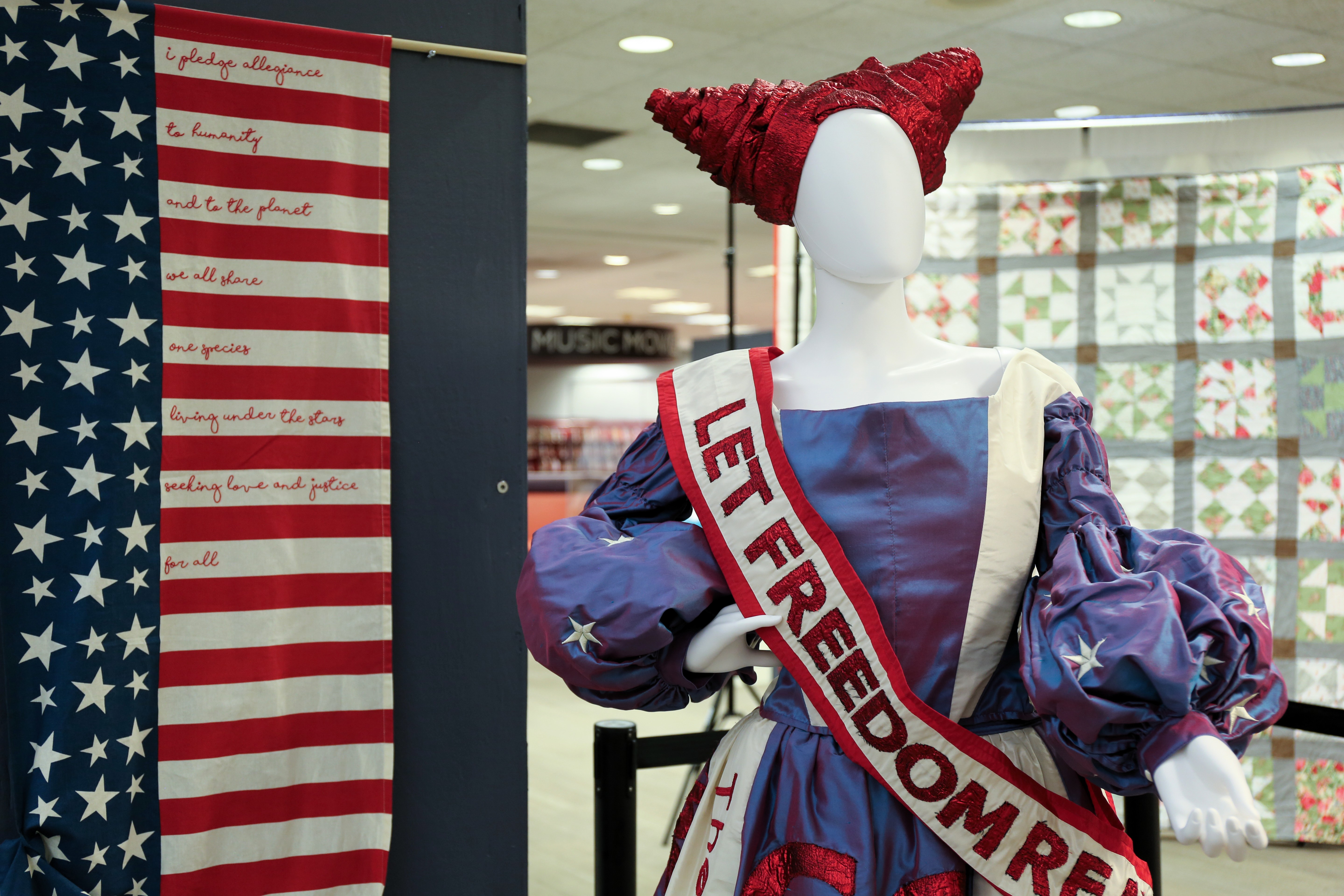 Other pieces in the exhibit include Rita’s Quilt, a nationwide collaborative art project that was created by Downey; sewn blankets from the Welcome Blanket Project, which are created for new immigrants who come to the U.S.; and the Let Freedom Read Dress, created in 2023 by Rachel Jane Wittmann and Kirby Gene Anderson.