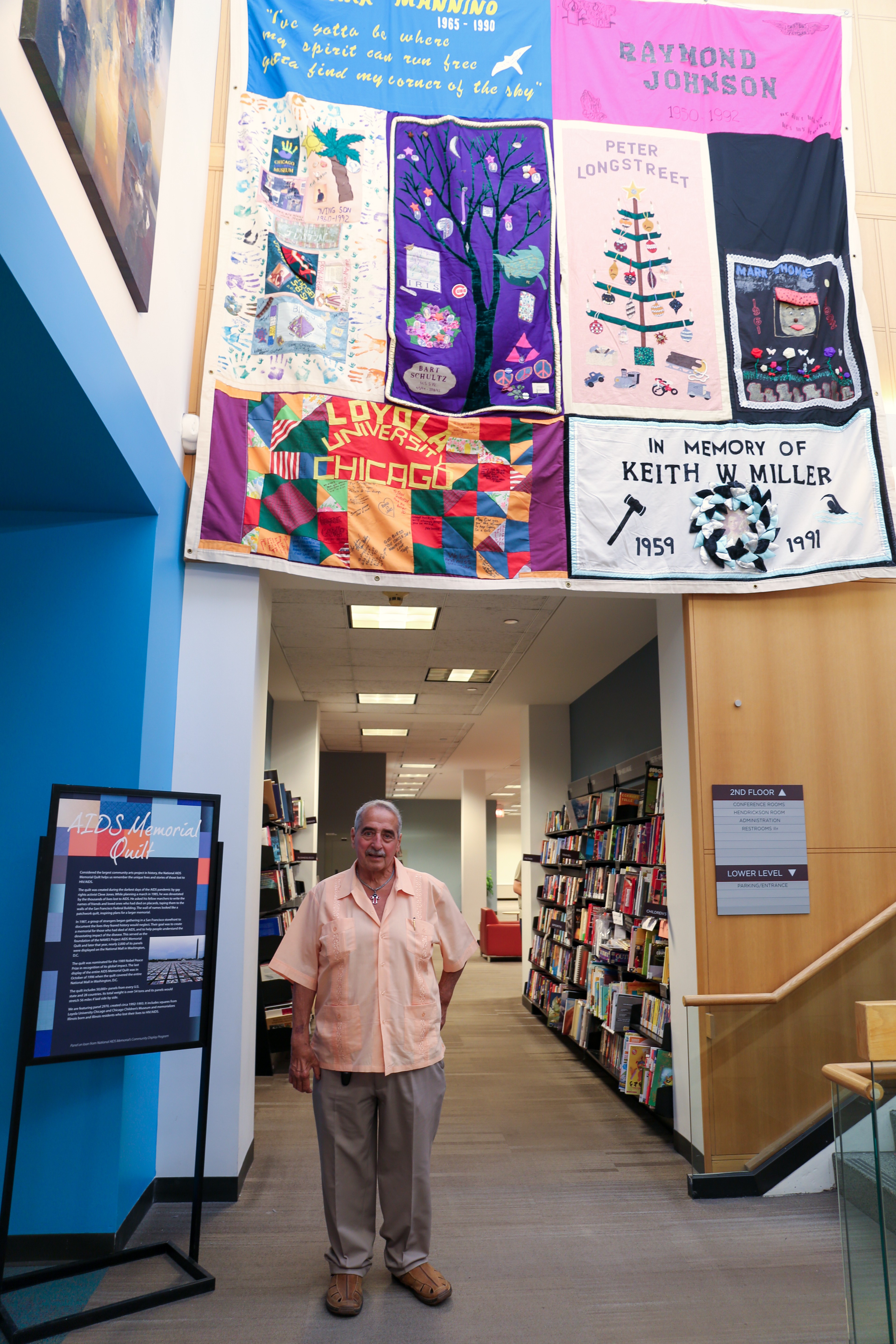 A 12-by-12-feet panel from the AIDS Memorial Quilt with local ties is on display as part of the exhibit. Attendee Joey Airdo was able to view this panel for the first time and said he was surprised by how large it was. Airdo is the brother of Kirk Airdo, who passed away in 1992 and is memorialized in the panel.